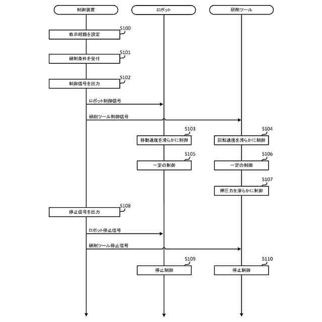 前記制御部は、前記研削条件が示す、前記ロボットにおける前記研削ツールを移動させる移動速度であって、滑らかに変化する当該移動速度に基づいて、前記ロボットを制御する、