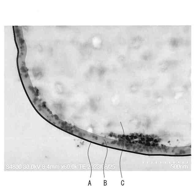 走査型電子顕微鏡で得られる前記トナー粒子断面の電子像において、前記トナー層Bに対応する領域を界面とすると、前記無機微粒子の存在率が小さい界面αと、前記無機微粒子の存在率が大きい界面βとが存在し、
