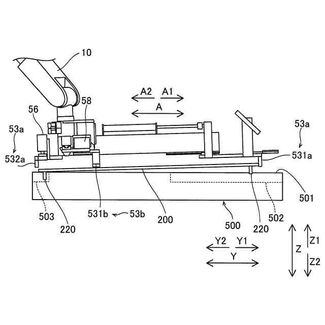 【解決手段】この基板搬送ロボット100では、制御部30は、基板200を持ち上げて搬送する際に、基板200の端部を把持部53aにより浮かせることにより、基板200を水平面に対して傾斜させて、水平面に対して傾斜した状態の基板200を把持部53bにより把持させることと、基板200を配置する際に、把持部53aおよび把持部53bに把持された基板200の端部を下降させることにより、基板200を水平面に対して傾斜させて、水平面に対して傾斜した状態の基板200の把持部53bによる把持を解除させることと、のうちの少なくとも一方の処理を実行する。