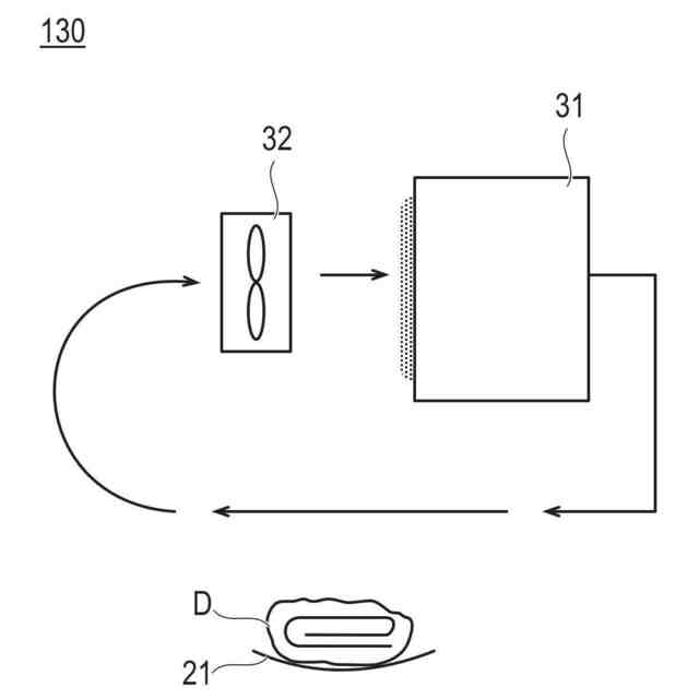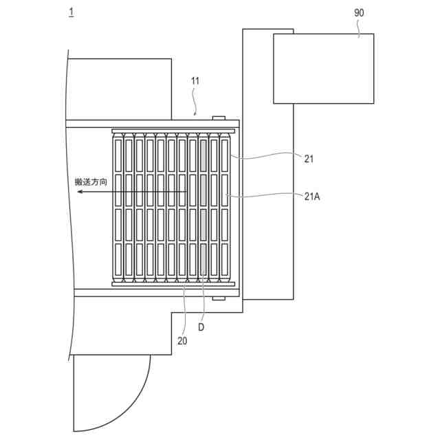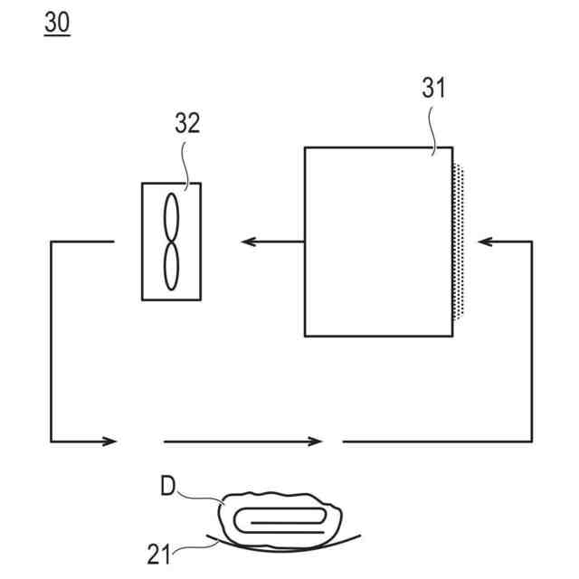 本実施形態において冷却装置1が冷却する被冷却物としては食品を挙げることができ、例えば伊達巻、だし巻き卵、かまぼこ、ロールケーキ等を例に挙げることができる。以下、被冷却物として伊達巻Dを挙げて説明する。冷却装置1は、図1~図7に示すように、搬入口11および搬出口12を備える断熱箱体10と、保持器21によって保持された被冷却物を搬入口11から搬出口12へ搬送する搬送装置20と、断熱箱体10の内部に設けられるクーラーユニット30と、断熱箱体10内を、第1領域R1および第2領域R2に区切る第1隔壁40と、断熱箱体10内を、第2領域R2および第3領域R3に区切る第2隔壁50と、断熱箱体10内を、第3領域R3および第4領域R4に区切る第3隔壁60と、第1領域R1に設けられ、保持器21を加熱する加熱部70と、第1領域R1に設けられ、保持器21に付着した結露水を除去する除去部80と、を有する。