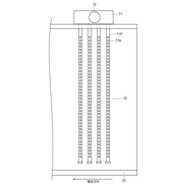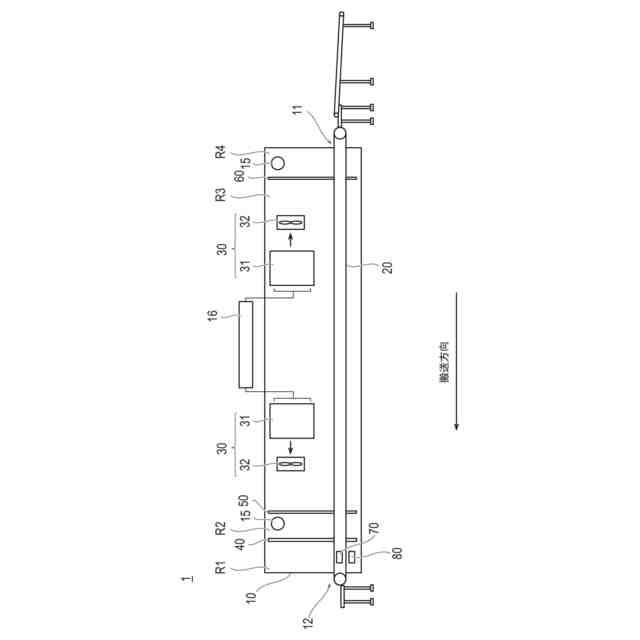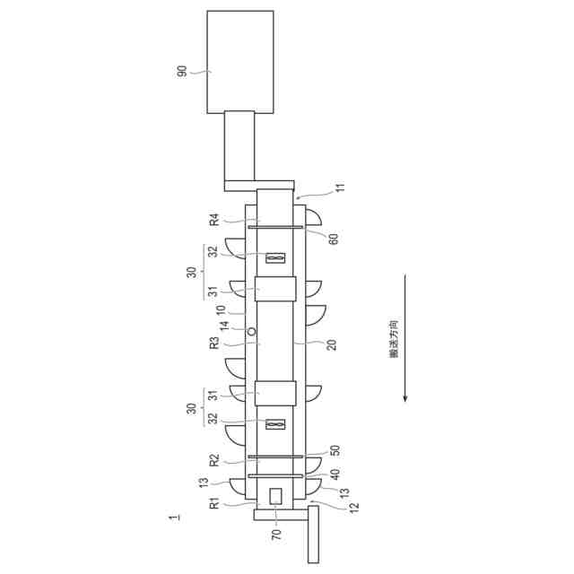 本発明の実施形態に係る冷却装置1を、図1~図9を参照しつつ説明する。図1は、本発明の実施形態に係る冷却装置1を示す平面図である。図2は、本実施形態に係る冷却装置1を示す正面図である。図3は、本実施形態に係る冷却装置1の搬入口11近傍を示す平面図である。図4は、本実施形態に係る冷却装置1の搬出口12近傍を示す平面図である。図5は、本実施形態に係る冷却装置1の搬出口12近傍を示す正面図である。図6は、図5のA部を示す部分拡大図である。図7は、図5のB部を示す部分拡大図である。図8は、吸込式のクーラーファン32を説明するための図である。図9は、押込式のクーラーファン32を説明するための図である。なお、図面の説明において同一の要素には同一の符号を付し、重複する説明を省略する。図面の寸法比率は、説明の都合上誇張されており、実際の比率とは異なる場合がある。