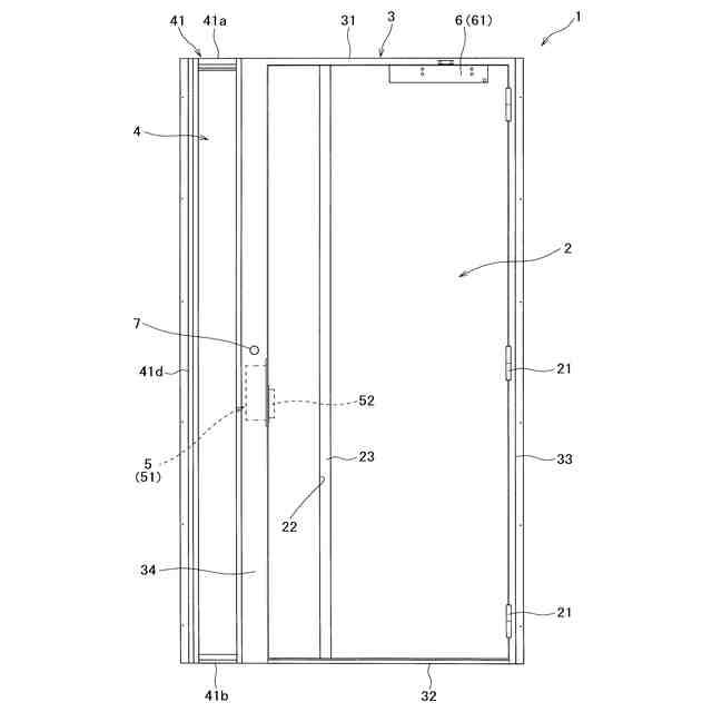 図1~図6に示すように、建具1は、扉体2と、枠体3と、袖部4と、錠装置5と、電動開閉装置(電動開閉手段)6と、室内操作ボタン7(錠操作手段、自動開閉操作手段)と、人感センサ8と、認証装置(認証手段)9と、制御ユニット10と、を備える。因みに人感センサ8は、ユーザーからの要求があった場合に取り付けられるオプション仕様として採用されるものであって、設けても設けていなくてもよい。