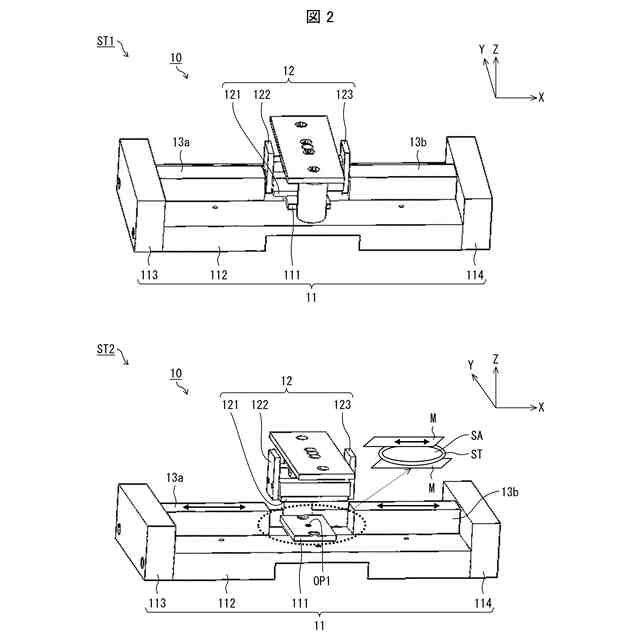 レオロジー測定装置10は、試料SAのレオロジー特性を測定するための装置である。レオロジーは、試料SAの粘性、粘弾性等に関わる特性である。後述のように、レオロジー測定装置10を用いて、膜形状の試料SAに面方向(図1においては、XY面と平行な方向)のせん断力を印加して、試料SAを観察することができる。