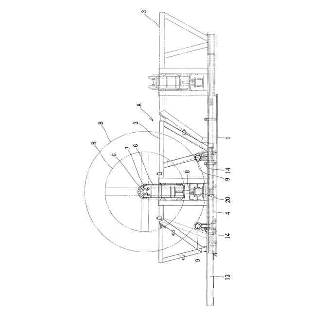 また、特許文献2の更生管運搬用コンテナ装置」は、ケーブルドラムの架台ではないが、埋設管の内壁にライニングされる更生管をドラムに巻き付けてなる更生管巻き付け体を貨物自動車で運搬するに際し、図9に示すように、更生管巻き付け体をクレーンで吊り上げて貨物自動車の荷台に設けたドラム架台に搭載する構成が開示されている。