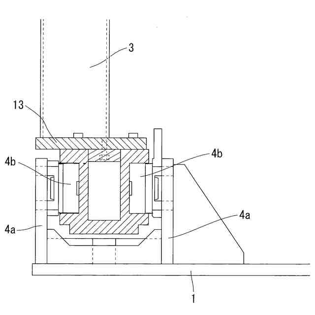 また、請求項2の発明は、前記固定側面枠体及び可動側面枠体の中央部に設けた縦孔の下部両側の同じ高さの位置に、位置保持ピンが水平方向に縦孔内に夫々突出自在に設けられ、これらの両側の位置保持ピンを縦孔の内側に突出させると、当該位置保持ピンが前記軸受け枠体の下端面に当たり、当該軸受け枠体は下降を阻止される構成とした、請求項1に記載のドラム架台とした。