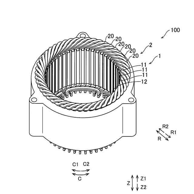 【解決手段】このステータ100は、複数のコイルエンド部20bは、スロット収容部20aに接続される接続部分21aと、軸方向視で、ステータコア1に対してステータコア1の接線方向に傾斜するとともに、軸方向外側に延びる接線方向傾斜部分21bとを有するスロット側傾斜部21を含む。