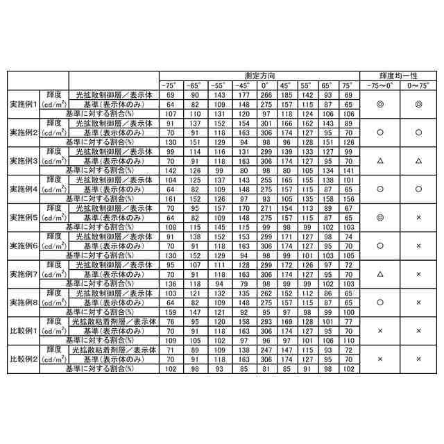 上述したような液晶ディスプレイや有機ELディスプレイを備える表示体では、その使用目的に応じた輝度分布を示すことが望まれている。上述した光拡散制御層を備えていない表示体では、通常、正面方向(表示面に対して垂直な方向)から観た場合に、最も明るく表示を視認し易いものとなっている。しかしながら、例えば、上記表示体をテレビとして使用する場合には、正面方向からだけでなく、斜め方向から観た場合においても、十分な明るさで視認できることが求められる。また、車のダッシュボード中央に設けられるモニターとして上記表示体を使用する場合には、正面方向よりも、むしろ運転席や助手席が位置する方向に向けて優先的に明るく表示させることが求められる。しかしながら、従来の表示体では、これらの要求に十分に応えられるものではなく、特に、使用目的に応じて輝度分布の制御を良好に行うことは困難であった。