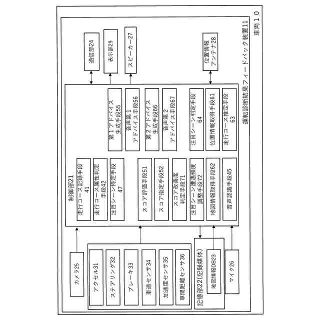 【解決手段】車両の前方の光景を撮影するカメラ25から走行コースの光景映像を記録する走行コース記録手段41と、光景映像を画像解析して、走行コースの属性を判定する走行コース属性判定手段42と、車両の内部に設置されたマイク26からの音声入力内容を認識する音声認識手段45と、音声入力内容から、現時点の前又は後における注目シーンを特定して記録する注目シーン特定手段47と、を有する運転診断結果フィードバック装置を用いる。
