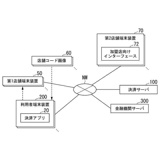 図1は、電子決済サービスが実現されるための構成の一例を示す図である。電子決済サービスは、決済サーバ100を中心として実現される。決済サーバ100は、例えば、一以上の利用者端末装置200、一以上の第1店舗端末装置50、一以上の第2店舗端末装置70、および金融機関サーバ300のそれぞれとネットワークNWを介して通信する。ネットワークNWは、例えば、インターネット、LAN(Local Area Network)、無線基地局、プロバイダ装置などを含む。
