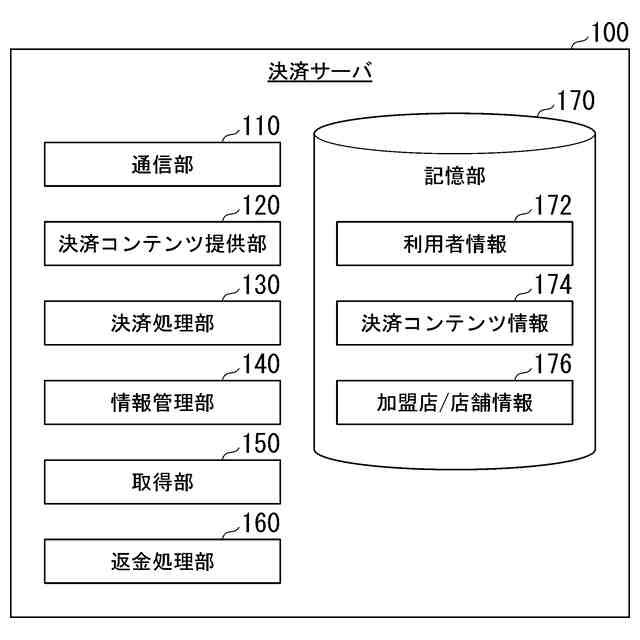 以下、図面を参照し、本発明の決済サーバ、金融機関サーバ、決済システム、決済方法、およびプログラムの実施形態について説明する。以下に登場する「サーバ」などの、利用者にサービスを提供したり内部解析を行ったりするための各種装置は、分散化された装置群によって実現されてよく、それぞれの装置を運用する事業者は異なってもよい。また装置のハードウェアの保有者(クラウドサーバの提供者)と実質的な運用を行う事業者も異なってよい。電子決済サービスは、店舗における商品やサービスの購買に係る決済をサポートするサービスである。店舗とは、例えば、現実空間に存在する物理的な店舗(実店舗)であるが、電子商取引の仮想店舗を含んでもよい。仮想店舗は、電子決済サービスの運営者とは異なる主体によって提供されるものを含んでもよい。その場合、仮想店舗における買い物の決済の際に、電子決済サービスのインターフェース画面に遷移するように制御される。電子決済サービスにおいて、店舗は、例えば加盟店(ブランド)に属するものとして扱われ、店舗において購買行動が行われた際の決済などの処理は、主として利用者と加盟店の間で行われる。これに代えて、決済などの処理が利用者と店舗との間で行われてもよい。