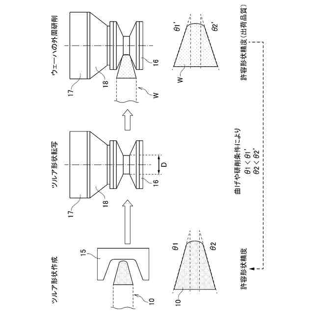 また、特許文献2は、ツルアの縁部を上下非対称の溝形状に成形し、ツルアとウェーハ研削砥石とを相対的に傾けて研削して溝形状を形成することが記載されている。