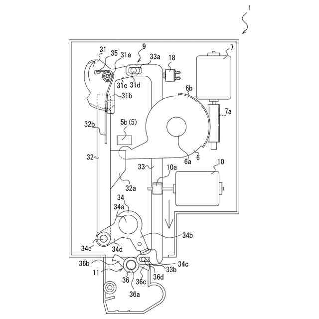 図1を参照すると、本発明の実施形態に係るドアラッチ装置1は、車両の一例である自動車のドアに施解錠のために設けられる。ドアには、ラッチ機構2が設けられている。ラッチ機構2は、車体に設けられたストライカ3を係脱可能に保持するフォーク4を備える。フォーク4は軸4aを中心に回転可能で、図において時計方向に弾性的に付勢されている。また、ラッチ機構2は、フォーク4に係脱可能で、フォーク4に係合してフォーク4とストライカ3の係合状態を維持可能なクロー5を備える。クロー5は軸5aを中心に回転可能で、図において反時計方向に弾性的に付勢されている。クロー5の操作部5bを時計方向(後述の図2~7では上方)に移動させることで、クロー5のフォーク4に対する係合を解除できる。