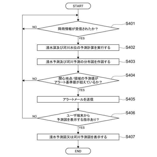 ここで、前記アラート通知は、電子メールによって実行され、前記アラート通知の内容は、場所、予測時刻、及び浸水深又は河川水位の予測値を含む、ことを特徴としてもよい。