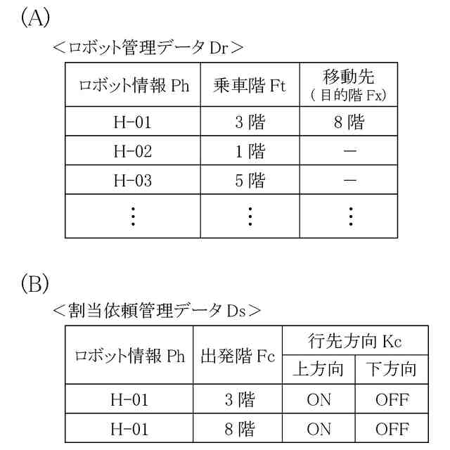 その一方で、エレベータを利用者してロボットを乗車階から目的階まで移動させる場合には、そのロボットの乗車階及び目的階をそれぞれ出発階及び行先階とする乗場呼びが乗りかごに割り当てられる必要があった。そして、当該乗場呼びが示す出発階に乗りかごが到着した場合に、その乗場呼びが示す行先階が、かご呼びとして登録されていた。従って、そのようなロボットについてのかご呼びの登録が、利用者が行先階ボタンを押した後のタイミングで行われた場合には、その利用者が登録したかご呼びがそのまま、ロボットについてのかご呼びとしても用いられることがあった。しかし、利用者は、そのことに気づくことはできず、一度押した行先階ボタンを再度押すことにより、自身で登録したかご呼びを削除することがある。そして、そのようなかご呼びの削除により、ロボットにとっては必要なかご呼びが削除されてしまうことがあった。