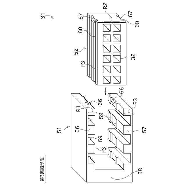 前記フラットケーブル用コネクタ端子が挿入される端子室の列である第3列と、