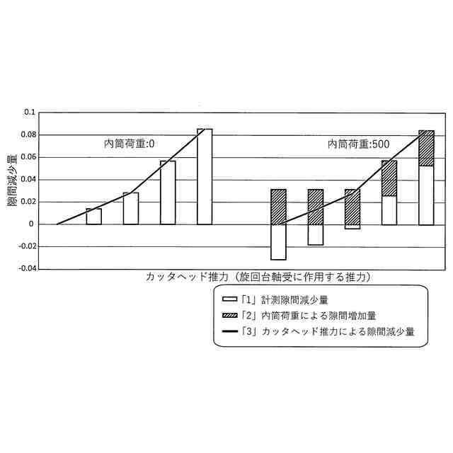 しかしながら、上記特許文献1のシールド掘進機では、回転輪の後面の面精度や、回転輪を支持する支持ローラと軌道面(回転時に支持ローラに接触する回転輪の接触面)とのクリアランスなどに起因して、回転輪の後面には、回転輪の回転に伴って傾きおよびうねりが発生するため、距離センサの計測値である回転輪の後面までの距離とカッタヘッド(旋回台軸受)の推力の関係が信頼性の乏しいものになる。このため、この回転輪の後面までの距離を計測する方法では、カッタヘッド(旋回台軸受)に作用する推力の大きさを精度よく取得することは難しく、従来より、カッタヘッド(旋回台軸受)に作用する推力を、精度よく取得する手段が求められている。