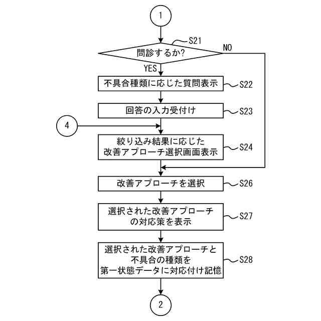 第一態様において、前記画面に表示された複数の不具合の種類から、前記縫製装置の状態に対応する不具合の種類の選択を受け付ける第一受付工程と、選択された不具合の種類を引き起こす不具合の原因とその改善策を含む複数の前記対応手段を、前記対応提示工程において前記適応順位に従って前記画面に提示した後、前記縫製装置の状態に応じた症状を示す1以上の前記対応手段を絞り込む絞込工程と、絞り込まれた前記対応手段から、前記縫製装置の状態に対応する前記対応手段の選択を受け付ける第二受付工程と、決定された前記対応手段を前記携帯端末の前記画面に提示する改善提示工程とを有してもよい。携帯端末は、ユーザによって選択された不具合の種類を引き起こす不具合の原因が含まれる対応手段から、不具合の内容に適した対応手段を更に絞り込むことで、不具合の速やかで確実な改善を図ることができる。