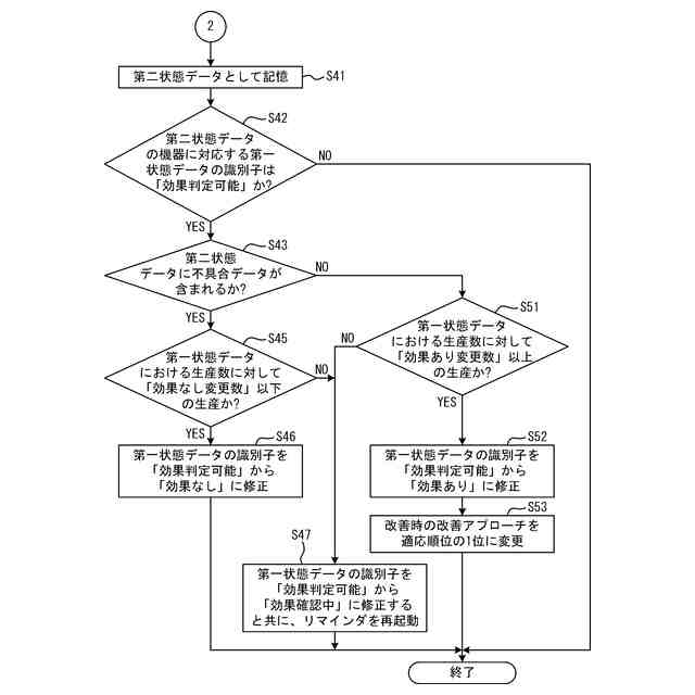 前記第一状態データと、前記タイマーに設定された前記条件を満たすと判定された前記第二状態データとに基づいて、前記対応手段の効果の有無を判断する第二判断工程と、