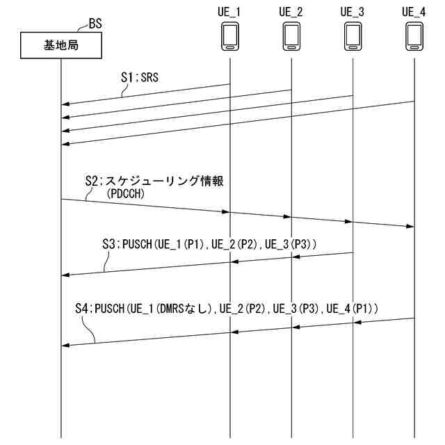 図5の例では、PUSCHにおいて、4台の端末UE_1,UE_2,UE_3,UE_4のデータ信号が同一時間スロットでMIMO多重されると共に、当該同一時間スロットのDMRSリソースにより当該4台の端末UE_1,UE_2,UE_3,UE_4の各DMRS(DMRS_1,DMRS_2,DMRS_3,DMRS_4)が多重される。基地局は、当該4台の端末(UE_1,UE_2,UE_3,UE_4)について、端末毎にDMRSによりデータ信号の復調を行う。端末UE_1のデータ信号の復調にはDMRS_1が用いられ、端末UE_2のデータ信号の復調にはDMRS_2が用いられ、端末UE_3のデータ信号の復調にはDMRS_3が用いられ、端末UE_4のデータ信号の復調にはDMRS_4が用いられる。各端末UE_1,UE_2,UE_3,UE_4は、PUSCHにおいて、自己がスケジューリングされた時間スロットでは、DMRSとデータ信号の両方を送信する。言い換えれば、基地局は、PUSCHのスケジューリングにおいて、PUSCHを割り当てる端末に対して、同一時間スロットでDMRSリソースとデータ信号用のリソースの両方を割り当てる。