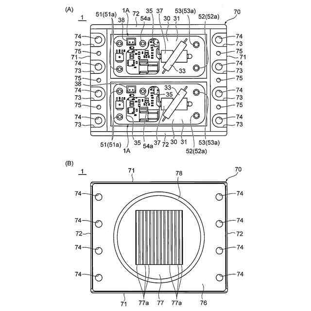 前記素子実装基板と、前記部品実装基板とが対向し、前記部品実装基板と前記コネクタ基板とが対向するように、前記素子実装基板、前記部品実装基板、および前記コネクタ基板を収容し、前記絶縁基板に接触した放熱板を、底壁として備えるケーシングと、