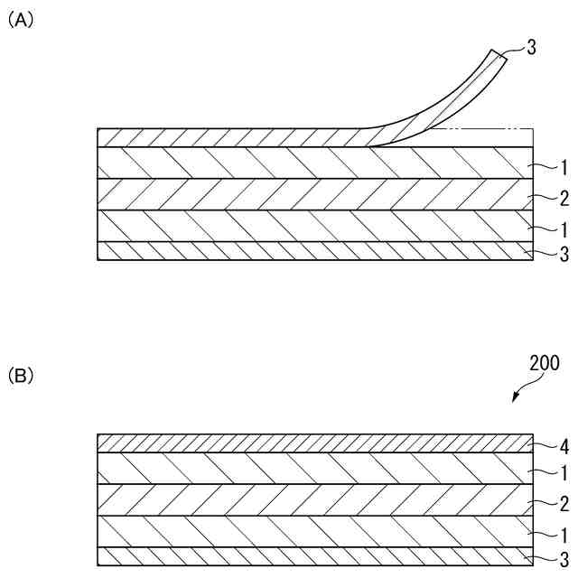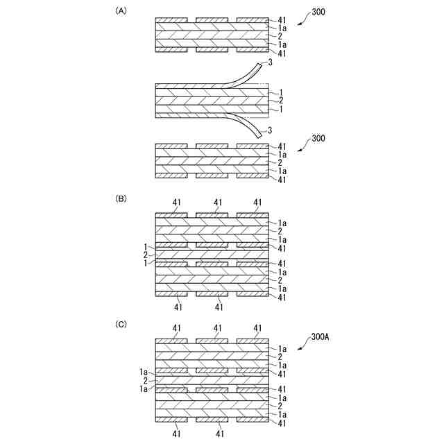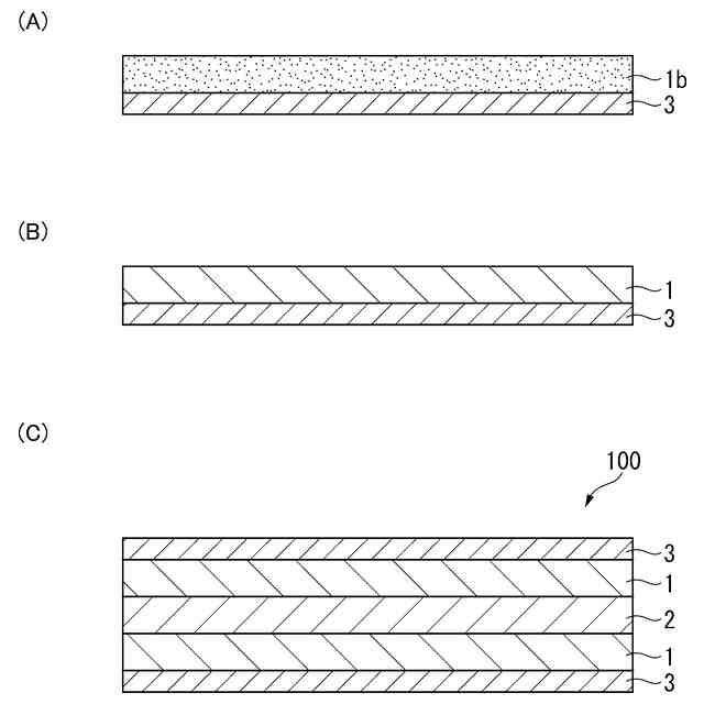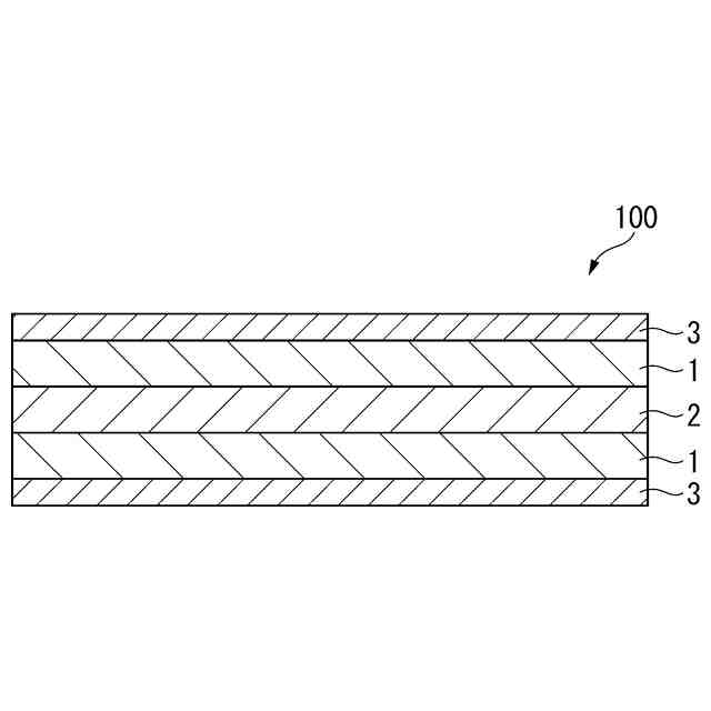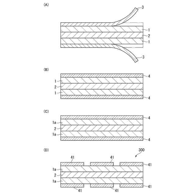 すなわち、樹脂フィルム100は、誘電率が低く、絶縁破壊強度が高いポリイミドフィルムからなるコア層2を備えている。また、接着性樹脂層1の硬化物の絶縁破壊強度も高い。そのため、耐電圧に優れ、かつ誘電率が低い。また、接着性樹脂層1は、エポキシ樹脂を含み、十分な接着性を有しているため、この樹脂フィルム100を用いて、多層配線基板300(図4参照)を作製できる。さらに、樹脂フィルム100は、絶縁破壊強度が高いため、膜厚が薄い場合でも、耐電圧を維持でき、薄膜化が可能となる。