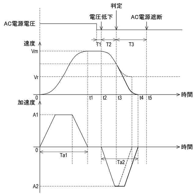 しかし、生産性向上のために工具マガジンの速度を増大させようとすると、特許文献1の技術を適用しても、停電と判定して減速を開始しても減速が不十分で、交流電源断後に強制的にブレーキがかかり、減速機に過大な負荷がかかる恐れがある。