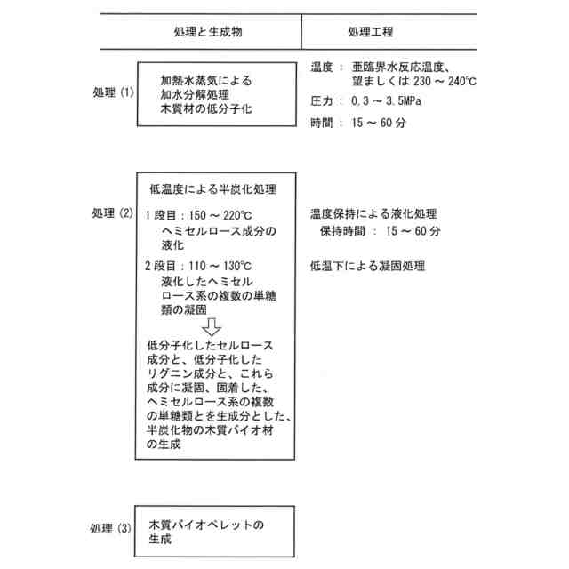 の温度領域とから形成し、150~220℃内の温度領域で木質材のセルロース成分とリグニン成分から低分子化したセルロース成分と低分子化したリグニン成分を形成し、木質材のヘミセルロース成分から液化したヘミセルロース系の複数の単糖類を形成し、110~130℃の温度領域で、セルロース成分及びリグニン成分に凝固、固着した、ヘミセルロース系の複数の単糖類を主成分とした、半炭化炭化物の木質バイオ材を形成すること
