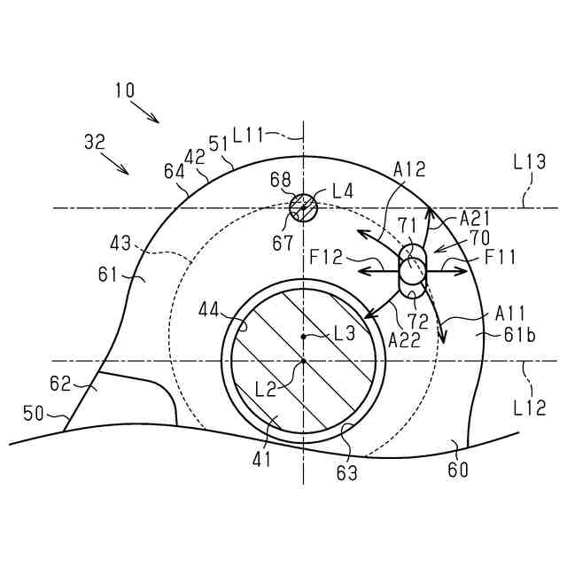 このような構成は、回転軸の軸方向から見て、回転軸の軸線及び偏心軸の軸線に対して偏心した位置を中心に回転軸に対してサブバランサをスイングさせる構成として好適である。
