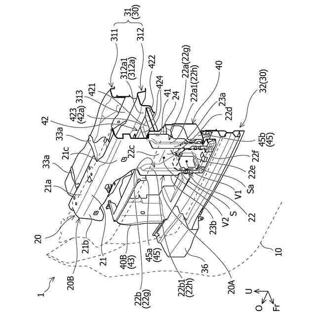 以下、本発明の実施の形態について添付図面を参照して説明する。図1は本発明の一実施形態に係る車両構造1の車両前方から視た斜視図であり、図2及び図3は車両構造1の要部を説明するための図であり、図2は斜視図であり、図3は上面図である。なお、図において、矢印Fr方向は車両前後方向で車両前方を示し、矢印O方向は車幅方向で車両外方(車幅方向外側)を示し、矢印U方向は車両上下方向で車両上方を示している。以下の説明における「前」及び「後」は車両前後方向における前及び後に対応し、「上」及び「下」は車両上下方向における上及び下に対応している。また、「左」及び「右」は、車両前側から車両後側に向かって視た状態での、車幅方向における左及び右に対応している。