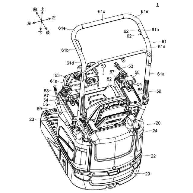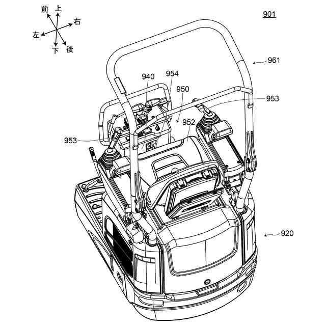 上部旋回体920には、キャノピタイプの運転室950が設けられている。運転室950には、フロントパネル940、オペレータシート952、操作レバー953、電源ソケット954及びキャノピポール961が設けられている。電源ソケット954は、フロントパネル940に配置されている。