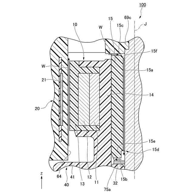 以下の実施形態において、下側は「軸方向一方側」に相当し、上側は「軸方向他方側」に相当する。なお、上側および下側とは、単に各部の相対位置関係を説明するための名称であり、実際の配置関係等は、これらの名称で示される配置関係等以外の配置関係等であってもよい。また、図2では、説明のために、中心軸線Jを挟んだ左右両側のそれぞれにおいて異なる周方向位置の断面を示している。