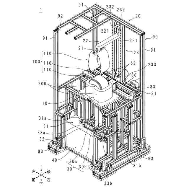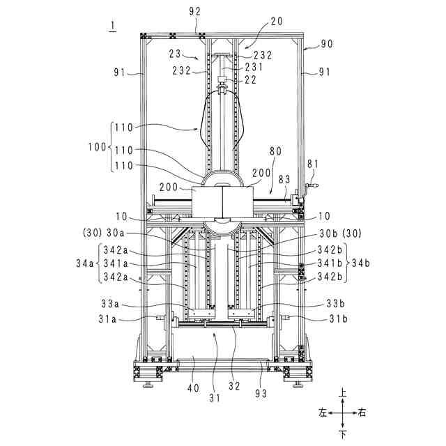 本実施形態に係る変圧器組立装置の要部を概略的に示す模式図である。