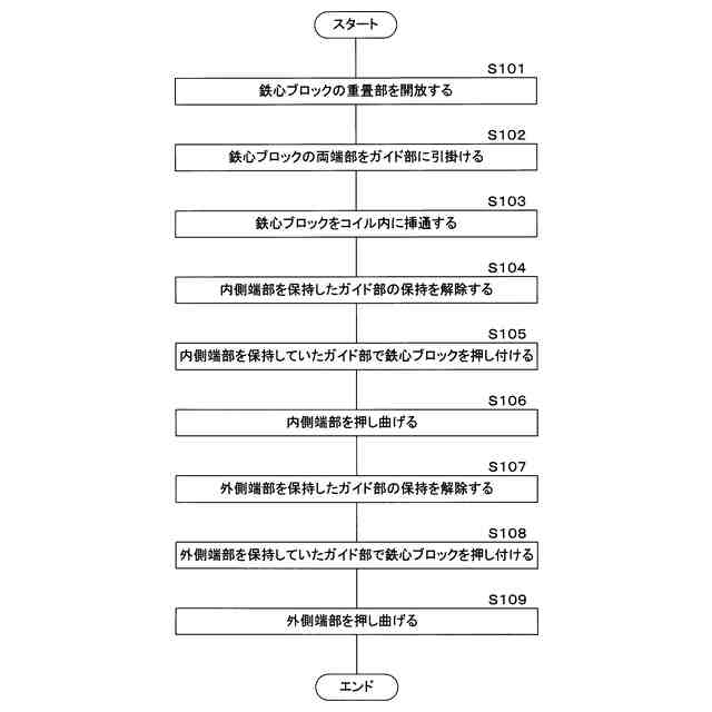 本実施形態に係る変圧器組立装置における、巻鉄心のコイルへの組み込み作業を説明するフローチャートである。