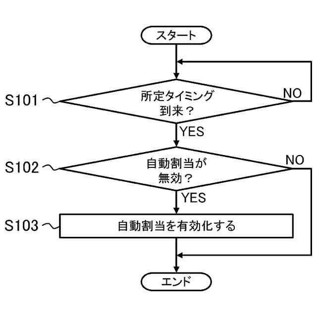 前記制御部は、前記管理者が不在である所定のタイミングにおいて、前記自動割当の動作が無効化されている場合に、前記自動割当の動作を自動的に有効化するように更に構成される、
