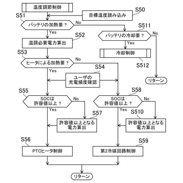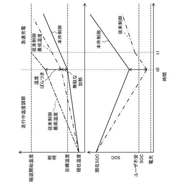 電動自動車は、バッテリから電気エネルギの供給を受けたモータが走行用駆動力を出力することによって、走行する。電動自動車の走行距離が長くなれば、バッテリのSOCは低下する。電動自動車の走行中にバッテリのSOCが低下すれば、電動自動車のユーザは、例えば充電スポットに停車をして、バッテリの充電を行う。バッテリは急速充電される場合がある。バッテリの充電時間が短くなるよう、バッテリの充電を開始する際のバッテリの温度は所定の温度であることが好ましい。