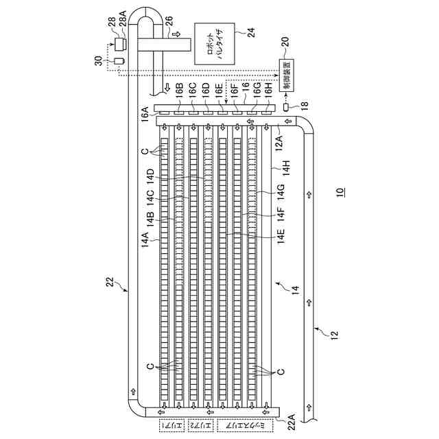 異なる品目、異なる等級の農産物を収納しているケースを、搬送ライン上をランダムに搬送する集出荷装置において、品目、等級ごとにケースを仕分けて段積みする農産物の出荷前処理方法が提案されている(特許文献1)。特許文献1では、入荷ライン11A、11Bの上手ライン部50において、ケース2、3に収納している農産物の検査、選別を行い、検査、選別済みのケース2、3を同一品目、同一等級ごとに仕分けして各中間ライン部51に集積している。その後、同一品目、同一等のケース2、3を所定数ごとに下手ライン部52に移し、下手ライン部52において、同一品目、同一等級の農産物を収納しているケース2、3を段積み手段55により複数段に段積みしている。