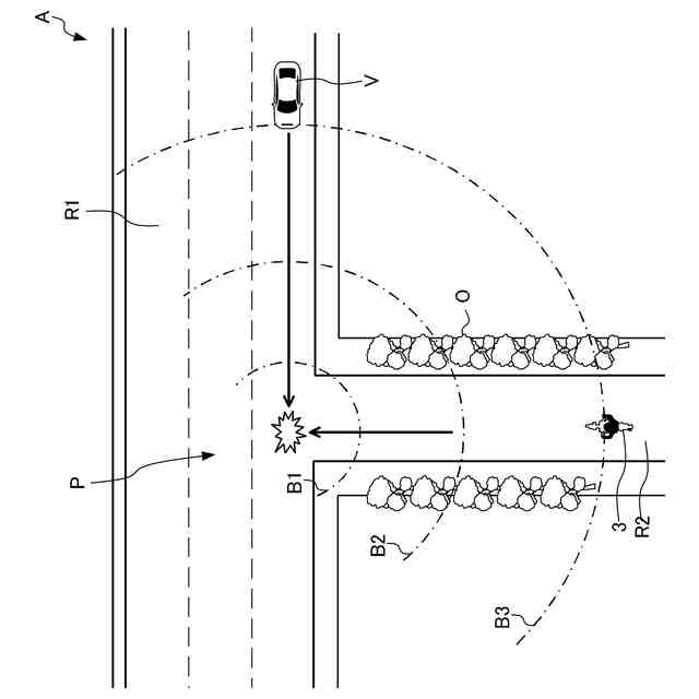 (1)本発明に係る交通安全支援システムは、鞍乗型車両(例えば、後述の自動二輪車3)である支援対象のライダーによる運転を支援するものであって、前記支援対象の周囲における交通参加者及び交通環境を認識する認識手段(例えば、後述の対象交通エリア認識ユニット60)と、前記ライダーが認知可能な態様で作動するマンマシンインターフェース(例えば、後述のHMI320)と、前記ライダーの頭部運動状態情報を取得する運転特性取得手段(例えば、後述のライダー状態センサ33及び運転主体情報取得ユニット61)と、前記認識手段によって前記支援対象又は前記支援対象の進行方向前方を中心とする第1範囲(例えば、後述のADAS作動範囲B1)外に他移動体(例えば、後述の他車両V)の存在が認識されている間、前記認識手段による認識結果及び前記頭部運動状態情報に基づいて第1通知作動条件(例えば、後述のアナログ通知作動条件)の成立の有無を判定する判定手段(例えば、後述のリスク通知設定ユニット64)と、前記判定手段によって前記第1通知作動条件が成立したと判定された場合、第1通知態様(例えば、後述のアナログ通知モード)で前記マンマシンインターフェースを作動させる通知制御手段(例えば、後述のHMI制御装置325)と、を備え、前記判定手段は、前記他移動体が移動する第1道路(例えば、後述の第1道路R1)と前記支援対象が移動する第2道路(例えば、後述の第2道路R2)とが各々の進行方向前方の特定交差点(例えば、後述の特定交差点P)において交差する場合であり、かつ前記支援対象が前記特定交差点を中心として定められかつ前記第1範囲を包含する第2範囲(例えば、後述のアナログ通知作動範囲B2)内に存在する間に、前記ライダーによる前記他移動体に対する確認行動が行われなかった場合、前記第1通知作動条件が成立したと判定することを特徴とする。
