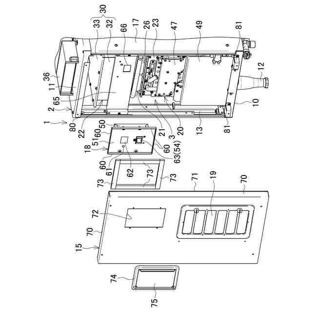 筐体2は、底板10と、天板11と、4本の脚12,12・・と、4本の縦フレーム13,13・・と、4本の横フレーム14,14・・と、前パネル15と、後パネル16と、左右の側パネル17,17とを含んでなる。底板10は、平面視矩形状で、四辺がそれぞれ上向きに折り返されている。各脚12は、底板10の下面四隅で下向きに取り付けられて底板10を水平に支持している。各縦フレーム13は、底板10の折り返し部に固定されて底板10の四隅に立設されている。各横フレーム14は、前後左右に隣接する縦フレーム13,13の上端間に架設されている。天板11は、横フレーム14,14・・に取り付けられて筐体2の上面を閉塞している。