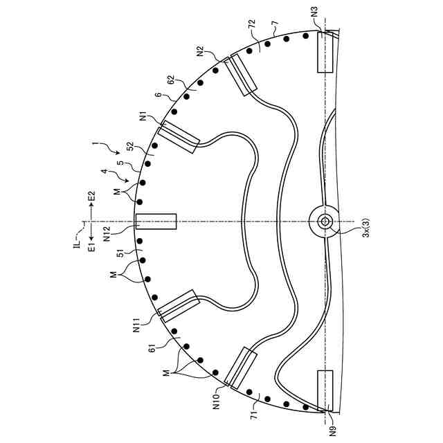 一つの前記境界線において、前記第一端部および前記第二端部が前記仮想線に対して線対称の位置に配置される