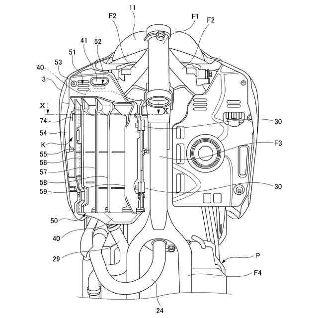 また、前記ラジエータシュラウド(50)は、複数のルーバ(54,55,56,57,58,59)を備え、前記複数のルーバ(54,55,56,57,58,59)のうちの前記ラジエータ(40)の外方に位置する外側ルーバ(54)が、前記サイドカウル(3)の内壁に近接配置されており、前記外側ルーバ(54)に、車体前面視で、前記吸気ダクト(74)を前方に露出させる切り欠き部(K)が形成されている点に第3の特徴がある。