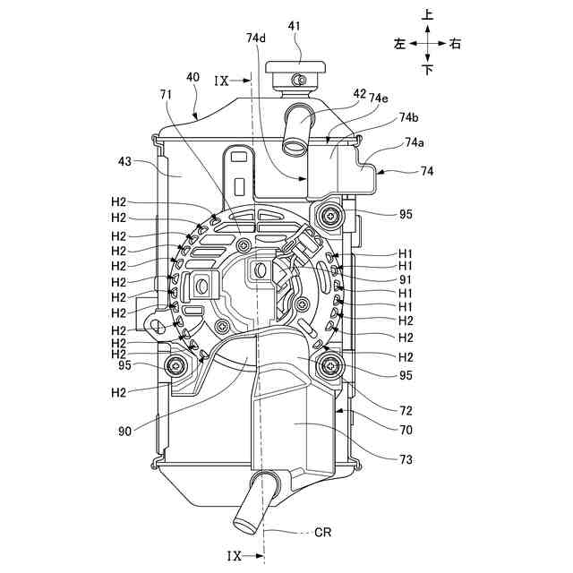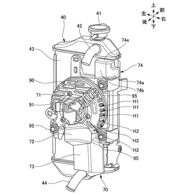 また、前記ラジエータ(40)の後方に配設される冷却ファン(90)と、前記ラジエータ(40)を後方から覆う冷却ファンカバー(70)とを備え、前記吸気ダクト(74)が、前記冷却ファンカバー(70)と一体に設けられている点に第4の特徴がある。