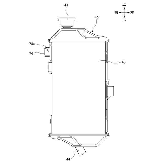 また、前記ラジエータ(40)を車幅方向外側から覆うサイドカウル(3)と、車体正面視で、前記ラジエータ(40)の少なくとも一部を覆うラジエータシュラウド(50)とを備え、前記吸気口(74c)は、前記サイドカウル(3)と、前記ラジエータシュラウド(50)との間で、前面視で露出する点に第2の特徴がある。