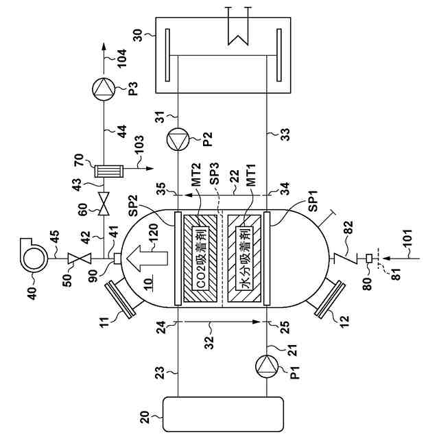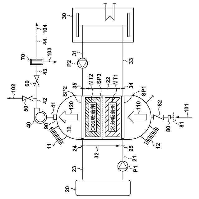 【解決手段】二酸化炭素回収装置は、処理槽に導入された気体に含まれる水分を吸着、または吸着した前記水分を脱着することが可能な第一吸着剤と、第一吸着剤の下流に配され、前記気体に含まれる二酸化炭素を吸着、または吸着した前記二酸化炭素を脱着することが可能な第二吸着剤と、を有し、第二吸着剤は、前記第一吸着剤から脱着した前記水分を用いて、前記二酸化炭素を脱着する。
