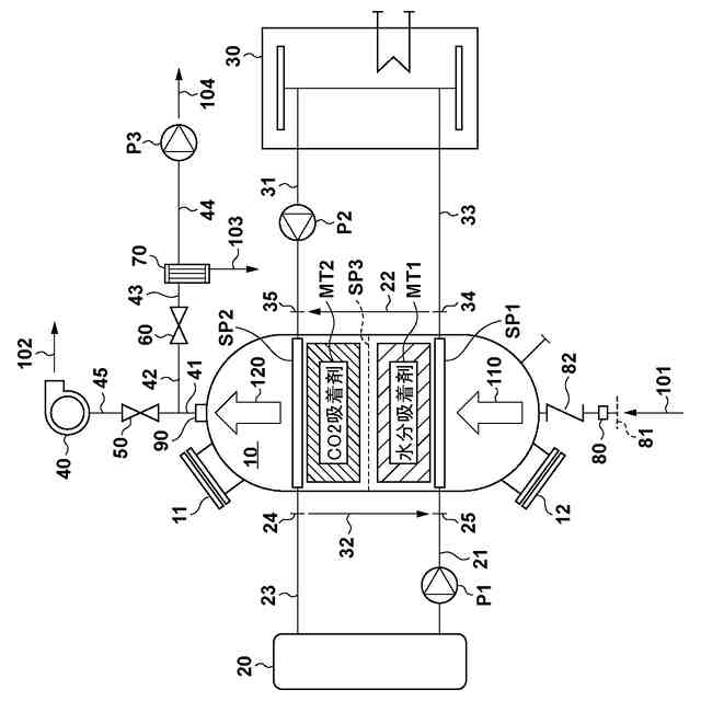 しかしながら、特許文献1の技術では、圧力スイング吸着法(PSA)で水と二酸化炭素を吸脱着させるため、高圧条件で排出される排ガスを利用する、または処理ガスを所定の圧力にするなどの条件設定が必要となるため、高圧条件の排ガスを処理する場合は場所が限定的になり得る。また、処理ガスを高圧にする場合は圧縮機やその他付随する大規模な設備が必要となるため、装置の使用において必要とされるエネルギー消費は増加し得る。更に、水の吸脱着において、吸着剤を再生するために脱着した水は、そのまま系外へと排出されてしまうため、水脱着のエネルギーがロスになる。