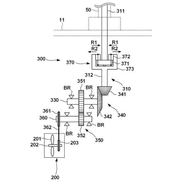 前記風車の回転軸と軸方向が異なる第一の駆動伝達軸と、