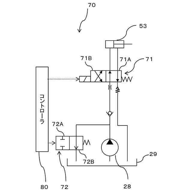 上記の目的を達成するために、本発明は、機体と、前記機体に回動可能に取り付けられたアーム部材および前記アーム部材の先端側に回動可能に取り付けられたアタッチメントを有する作業装置と、前記アーム部材の先端部に取り付けられ、ロッドの伸縮動作により前記アタッチメントと前記アーム部材とを着脱可能に接続するロック用油圧シリンダを備えたクイックカプラと、前記作業装置を操作するための操作装置と、前記ロック用油圧シリンダに作動油を供給する油圧ポンプと、前記作動油を貯留する作動油タンクと、前記油圧ポンプと前記ロック用油圧シリンダとの間に設けられ、前記油圧ポンプから吐出された前記作動油を前記ロック用油圧シリンダのボトム室またはロッド室に導くように切り換わる切換弁と、前記油圧ポンプと前記切換弁との間に設けられ、前記油圧ポンプから吐出された前記作動油を昇圧させるか否かを制御する昇圧弁と、前記切換弁および前記昇圧弁をそれぞれ制御するコントローラと、を備えた作業機械において、前記アタッチメントに取り付けられたピンに対する前記クイックカプラの接触状態を検出する接触状態検出装置を有し、前記コントローラは、前記接触状態検出装置で検出された検出値に基づいて、前記クイックカプラと前記ピンとの接触状態を判定し、前記クイックカプラと前記ピンとが接触状態であると判定した場合に、前記昇圧弁を昇圧させるように制御するとともに、前記作動油を前記ロック用油圧シリンダの前記ボトム室に導くように前記切換弁を切り換えることを特徴とする。