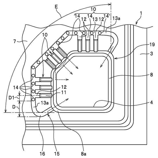 積層セルスタックには、図4に示すように流体通路7に発電材料流体Hを分配供給する流体供給用マニホルド9が設けられている。また、積層セルスタックには、流体通路7から流下する流体Hを集めて排出する流体排出用マニホルド19が設けられいる。流体供給用マニホルド9及び流体排出用マニホルド19は、枠部材6及びセパレータ3に形成された連通孔4が積層方向Wに連通することで構成されている。実施形態では主に流体排出用マニホルド19の構成について説明し、同様に構成される流体供給用マニホルド9についての説明を一部省略する。