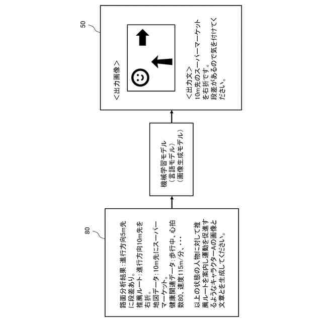 少なくとも1つのプロセッサが、前記路面データを含むプロンプトを、機械学習済みのコンテンツ生成モデルに入力し、前記コンテンツ生成モデルによって前記路面を通る前記ユーザに提示するコンテンツを生成するコンテンツ生成処理と、