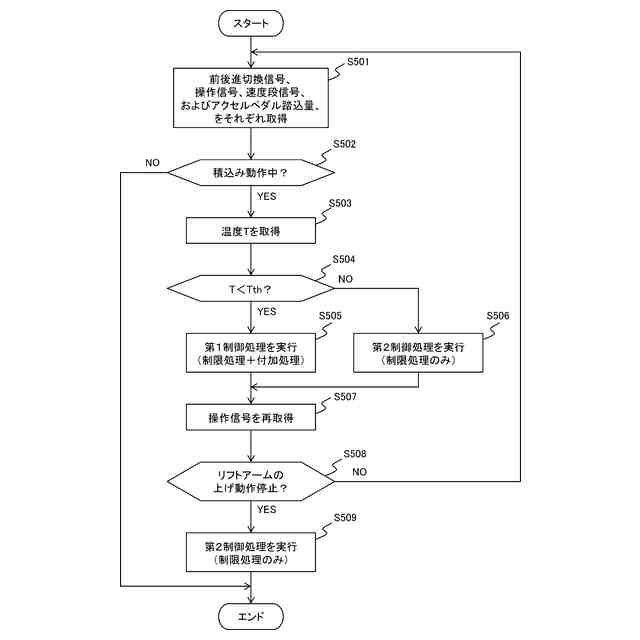 前記走行状態検出装置で検出された前記車体の走行状態および前記動作検出装置で検出された前記リフトアームの動作状態に基づいて、前記車体が前進走行しながら前記リフトアームが上方向に動作する積込み動作中である否かを判定し、