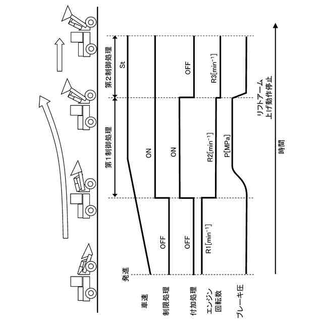 【解決手段】車体に対し上下方向に回動可能なリフトアーム21を有する作業装置2と、車体を走行させ、かつ、作業装置2を動作させるためのエンジン3と、車体に制動をかけるブレーキ装置8と、エンジン3およびブレーキ装置8をそれぞれ制御するコントローラ5と、を備えたホイールローダ1において、コントローラ5は、前進走行しながらリフトアーム21が上方向に動作する積込み動作中である場合に、エンジン3の回転速度を、最高回転速度R1よりも小さい値であって、かつ、ブレーキ装置8が非作動である場合に車速が目標車速Stとなる目標回転速度R3よりも大きい値R2にすると共に、実車速と目標車速Stとの差に基づいて設定されたブレーキ設定圧Pでブレーキ装置8を作動させて車速を制限する。